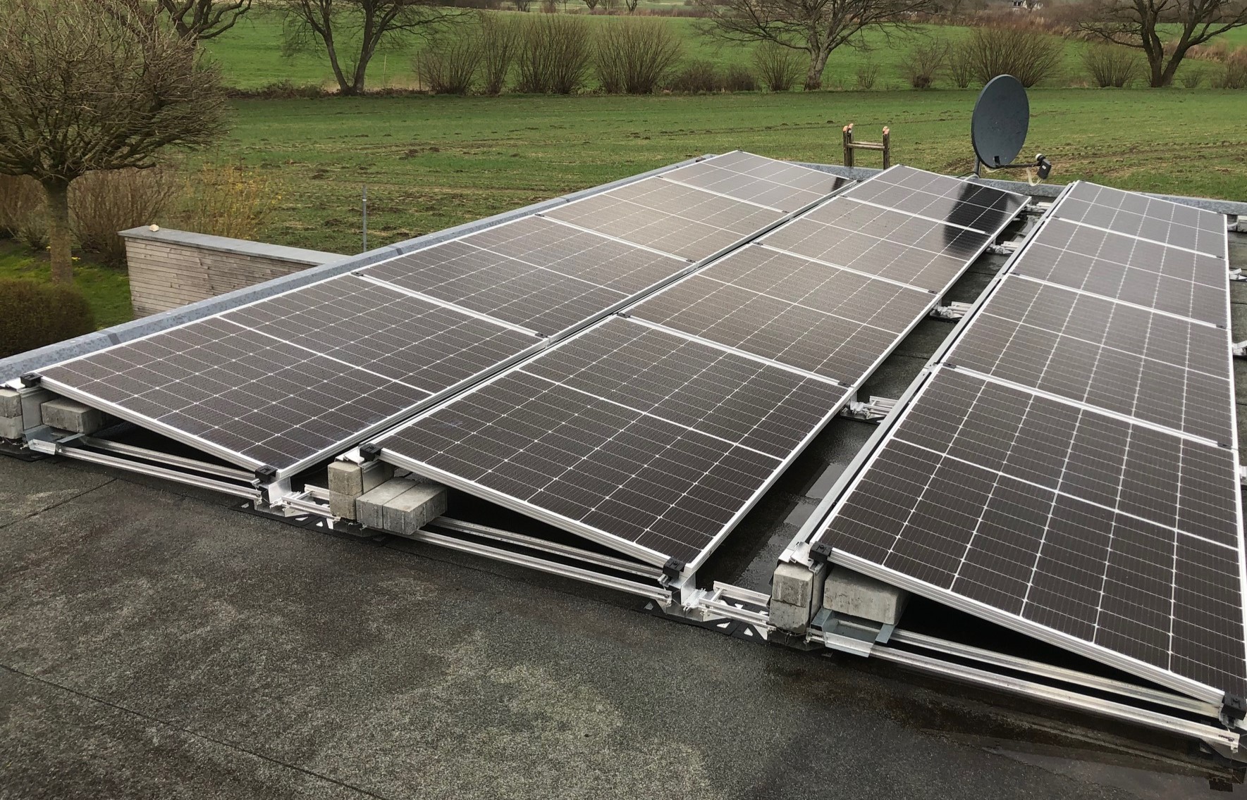 Flachdach Aufständerung, Süd-West Ausrichtung, Befestigung ohne Dachdurchdringung mit Hilfe einer Ballastierung